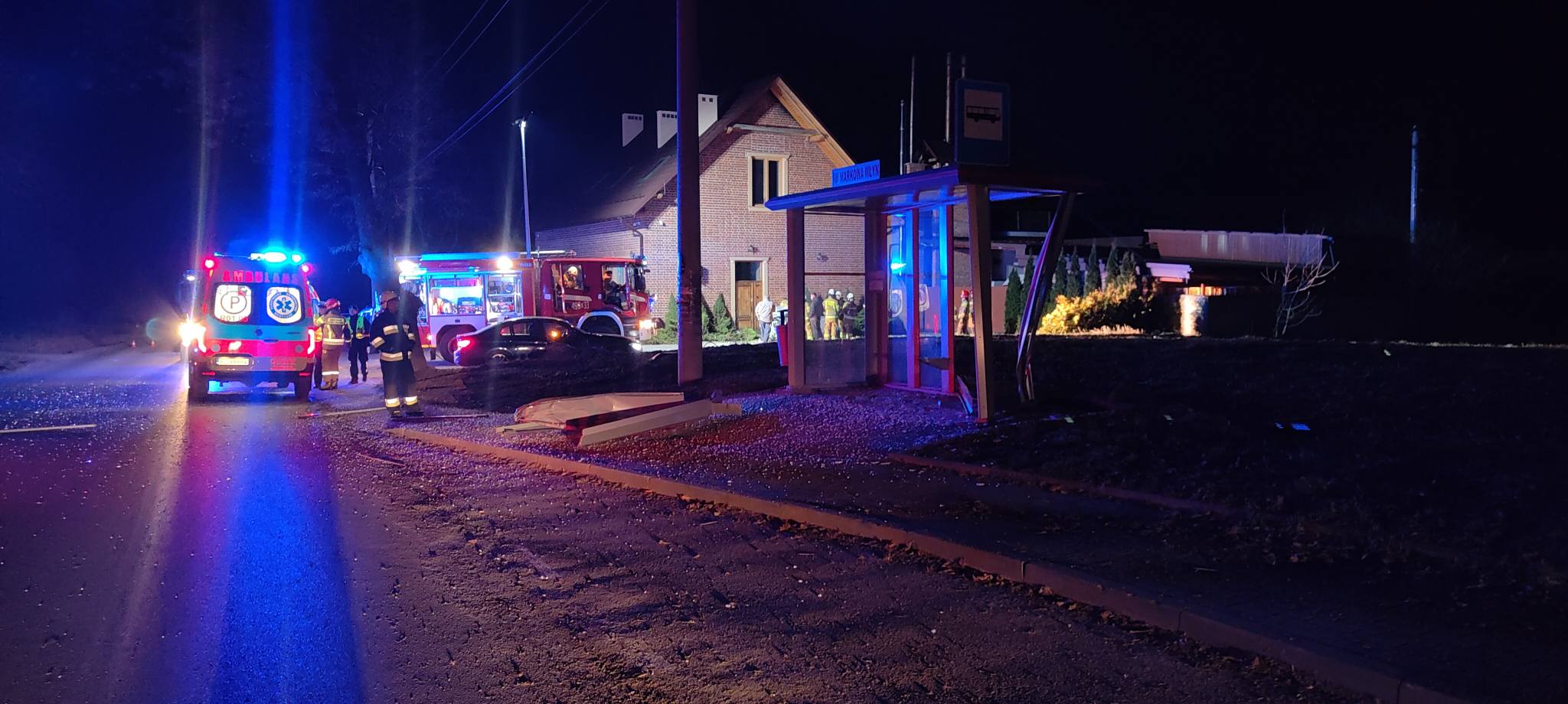 Po zjechaniu z drogi audi najpierw uderzyło w wiatę przystanku autobusowego, a następnie w budynek piekarni stojący przy drodze. Siła uderzenia była na tyle duża, że zarówno przystanek, jak i elewacja obiektu zostały poważnie uszkodzone. Nocny huk rozbitego samochodu i zniszczonej infrastruktury postawił na nogi okolicznych mieszkańców.