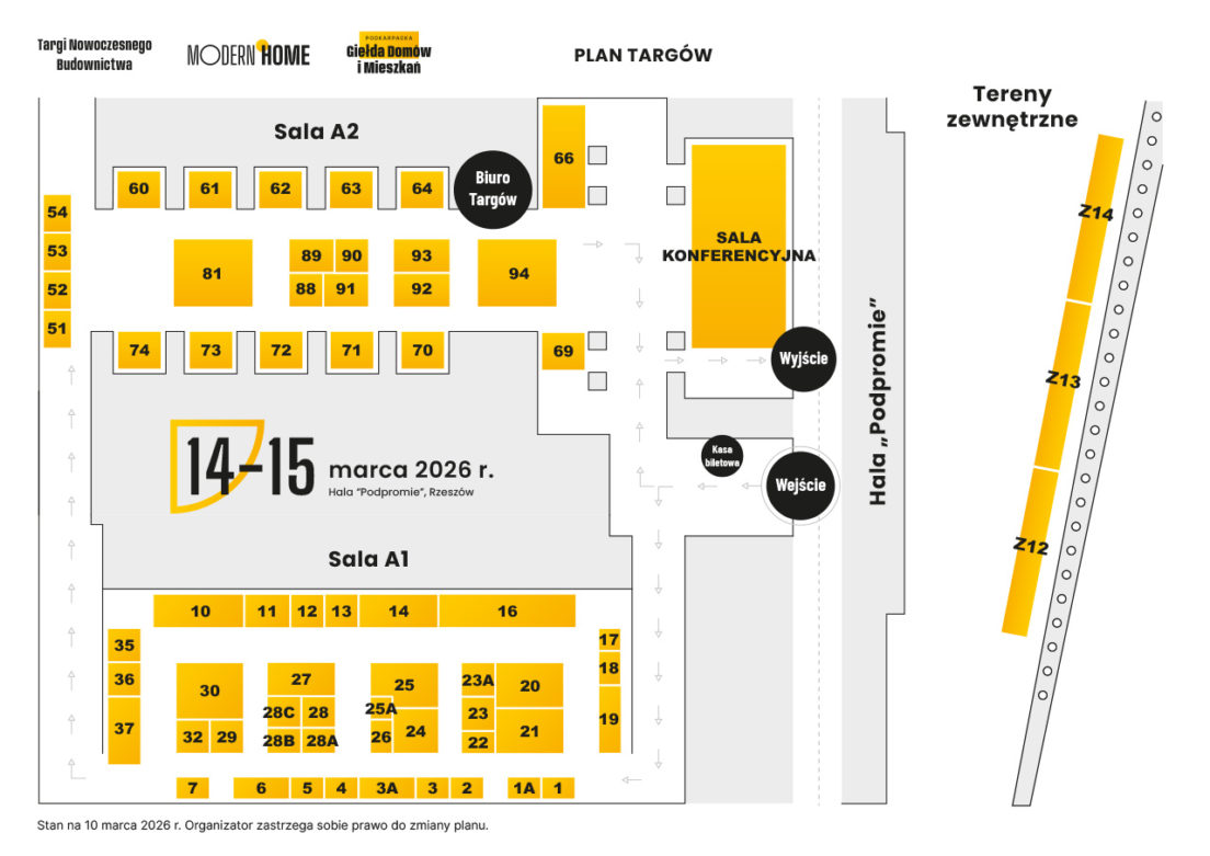 Bogato reprezentowany jest segment finansowania inwestycji: Bank Polskiej Spółdzielczości, Bank Spółdzielczy w Rzeszowie oraz pośrednik Różańska Kredyty i Nieruchomości umożliwią zwiedzającym porównanie ofert kredytowych na miejscu. Targi dopełniają wystawcy z obszaru ogrodnictwa, w tym dwie szkółki roślin, oraz stoiska Leroy Merlin, Okręgowego Inspektoratu Pracy i Polskiej Agencji Inwestycji i Handlu, co nadaje wydarzeniu charakter kompleksowego forum budowlano-inwestycyjnego. Pełny plan rozmieszczenia stoisk dostępny jest na stronie targirzeszowskie.pl.