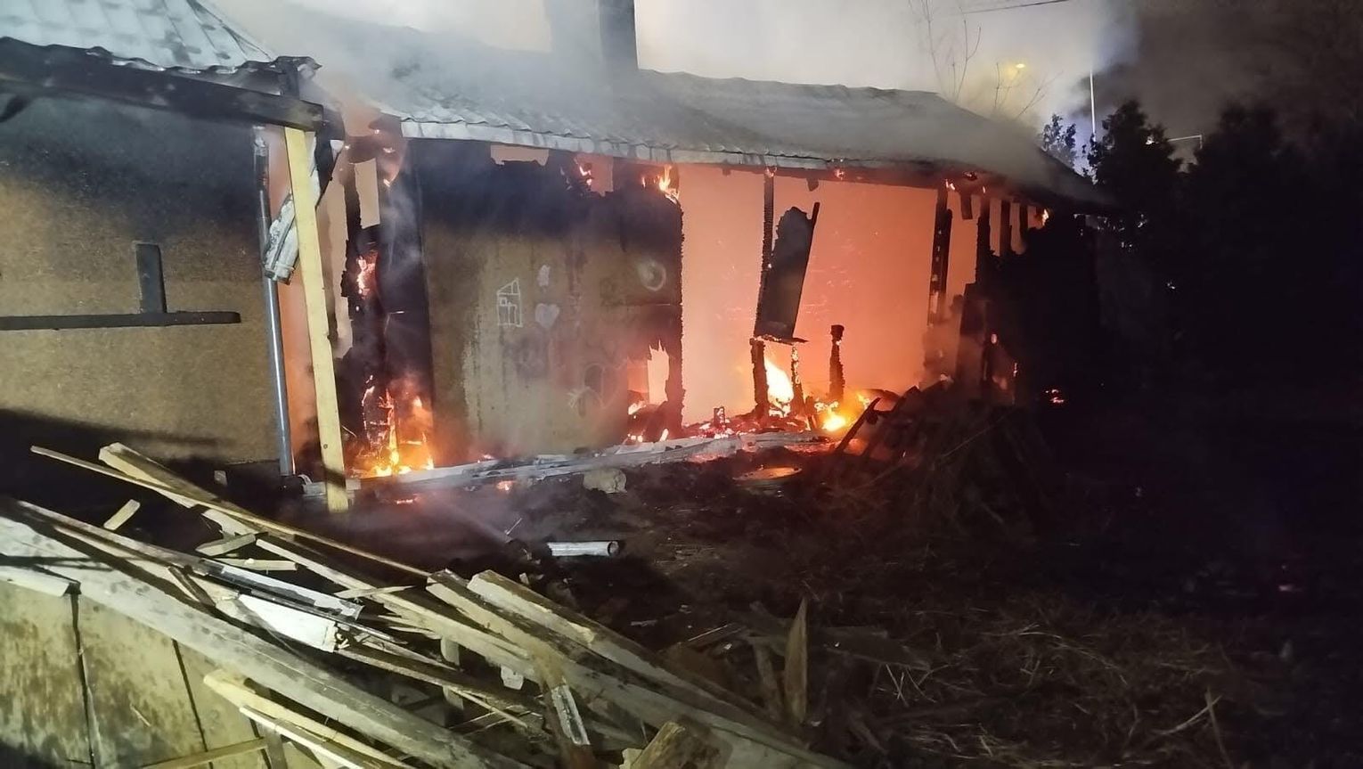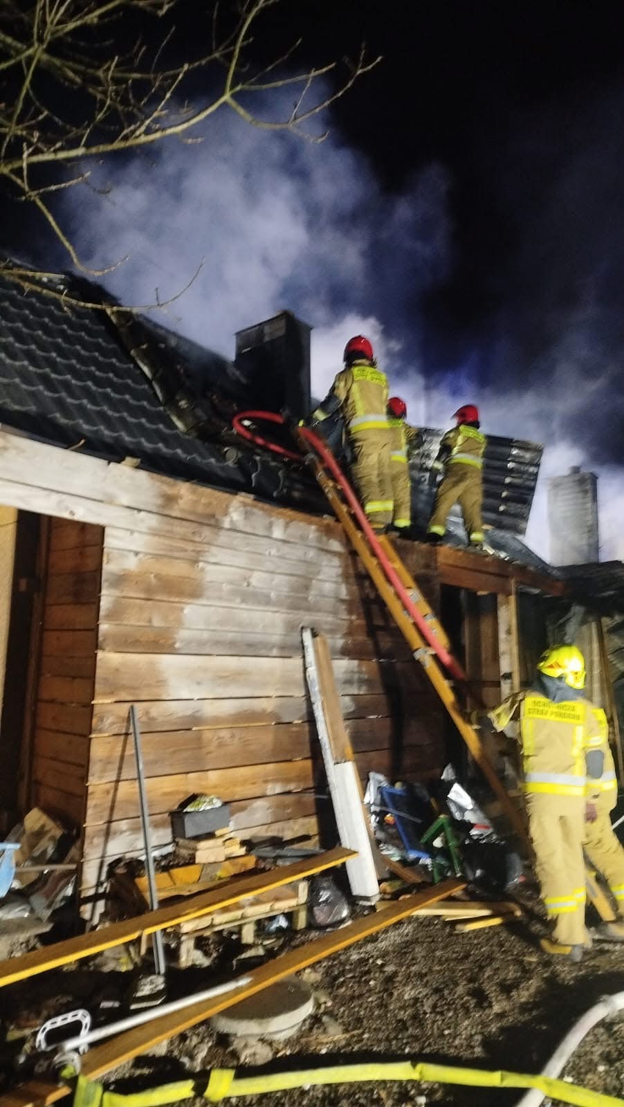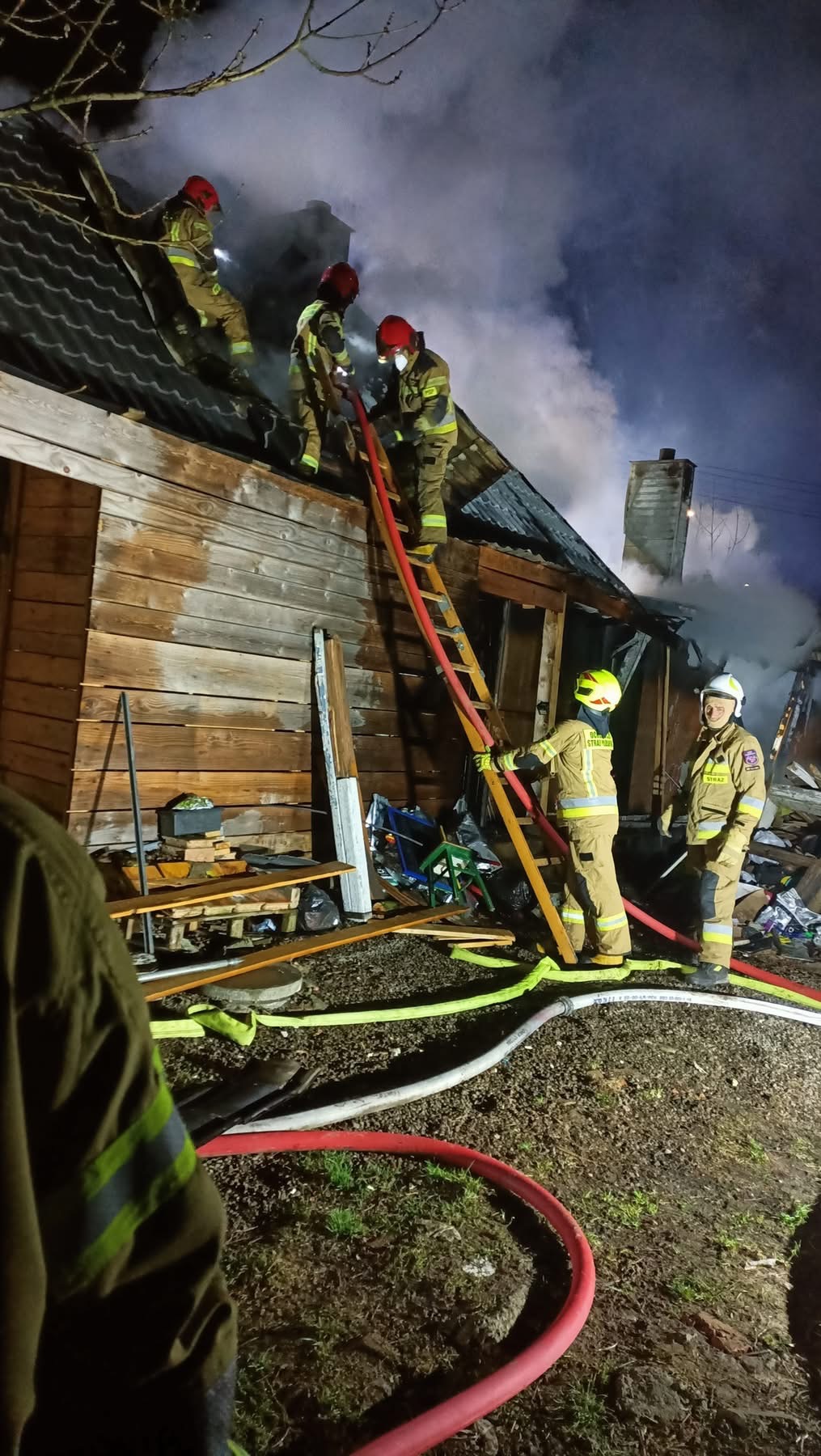 W trakcie działań doszło do częściowego zawalenia się konstrukcji, co znacznie utrudniło akcję. Ratownicy pracowali w aparatach ochrony dróg oddechowych, w silnym zadymieniu i wysokiej temperaturze. Pożar udało się opanować dopiero po kilku godzinach. Działania zakończono około godz. 6:00–6:40. Na miejscu pozostał zastęp OSP Tyczyn, który dozorował pogorzelisko.