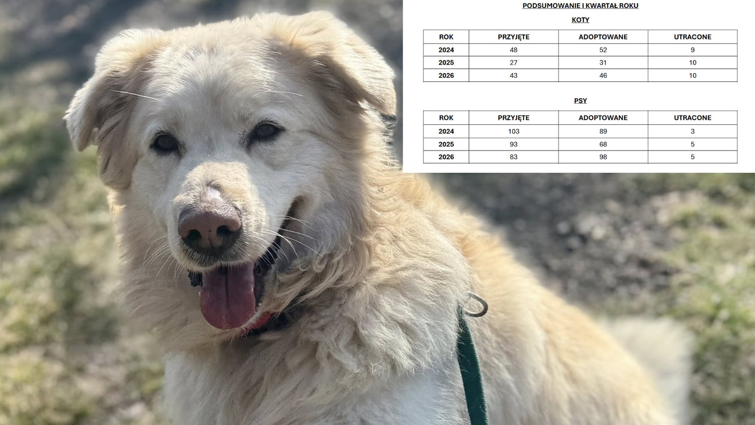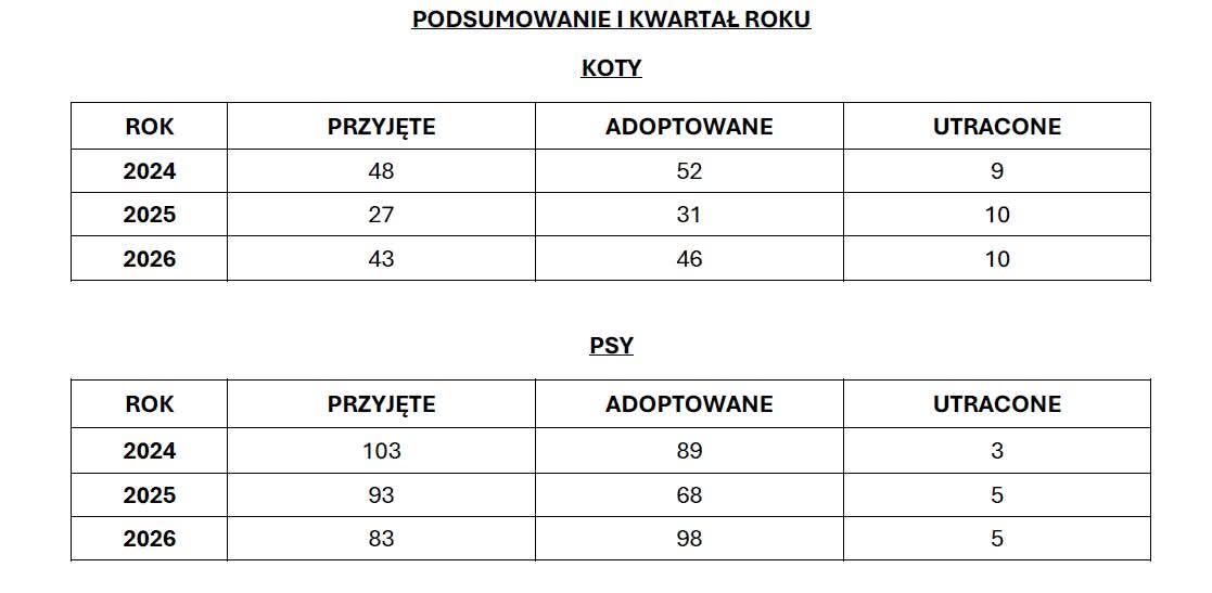 W opublikowanym przez pracowników schroniska podsumowaniu I kwartału przedstawiono dane z lat 2024–2026. Obejmują one zarówno psy, jak i koty. W kategorii psów pierwsze miesiące bieżącego roku okazały się wyjątkowe.