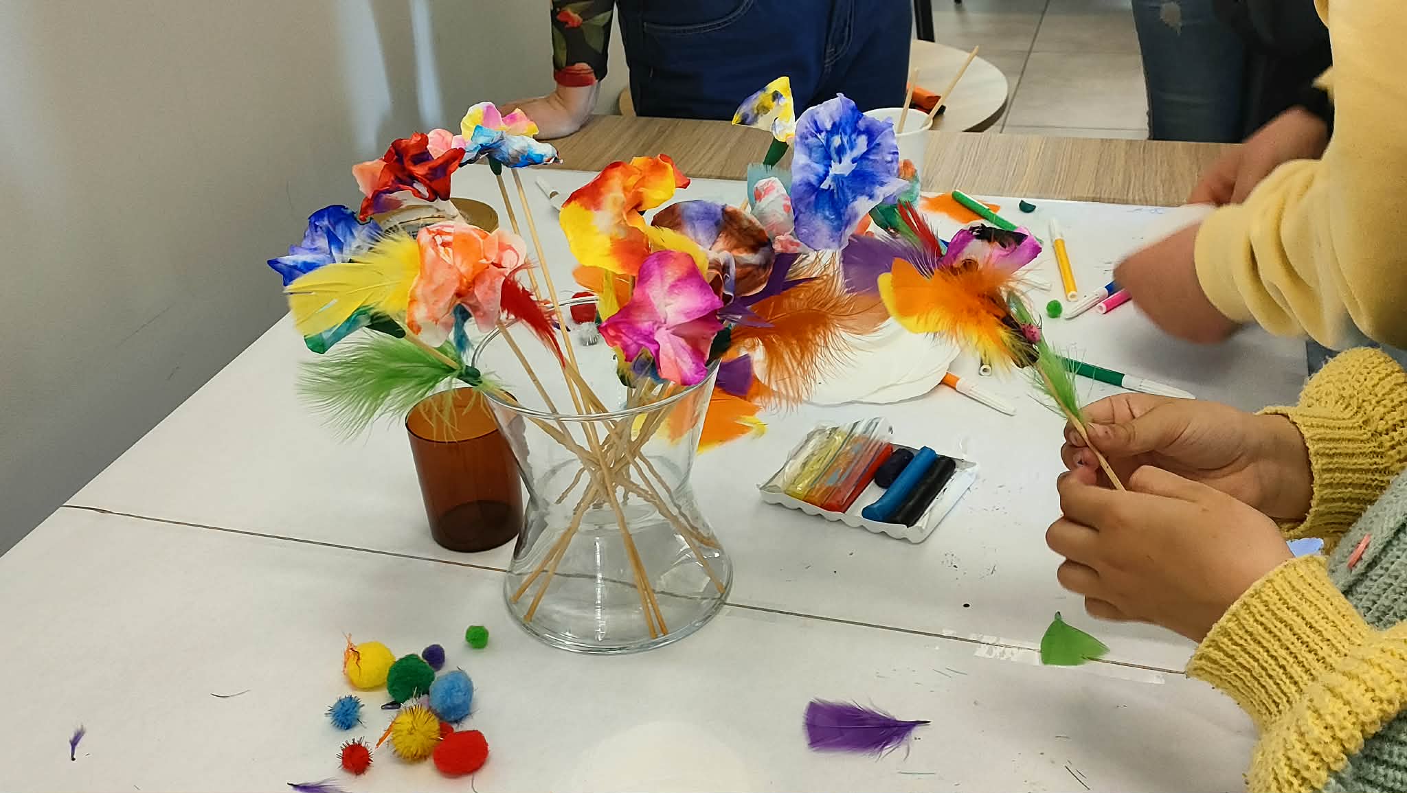 Dzieci miały okazję m.in. przygotować swoje autorskie przypinki, koktajle, a także papierowe ozdoby inspirowane prawdziwymi kwiatami. W tym ostatnim przypadku otrzymały one wsparcie nie tylko od opiekunów, ale również od samego wicestarosty.