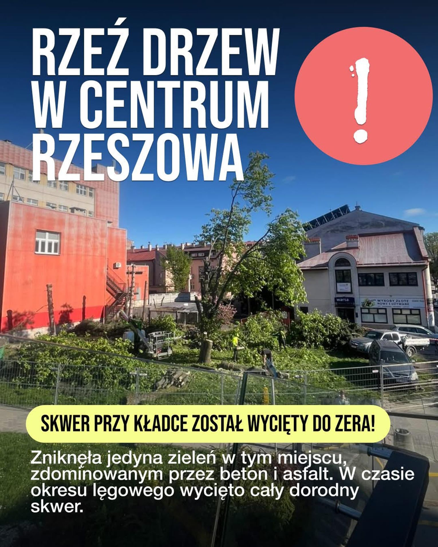 Od dwóch dni mieszkańcy centrum Rzeszowa obserwują, jak ze skweru przy skrzyżowaniu al. Piłsudskiego i ul. Grunwaldzkiej znikają dorodne drzewa. Mowa o terenie obok okrągłej kładki i budynku Urzędu Wojewódzkiego, który do tej pory wyróżniał się w tej części miasta niewielką, ale widoczną enklawą zieleni. Zgodnie z relacjami Strefy Działań Miejskich, zniknął pokaźny kasztan oraz wszystkie drzewa iglaste rosnące w tym miejscu, skwer został praktycznie „wyczyszczony” do zera.