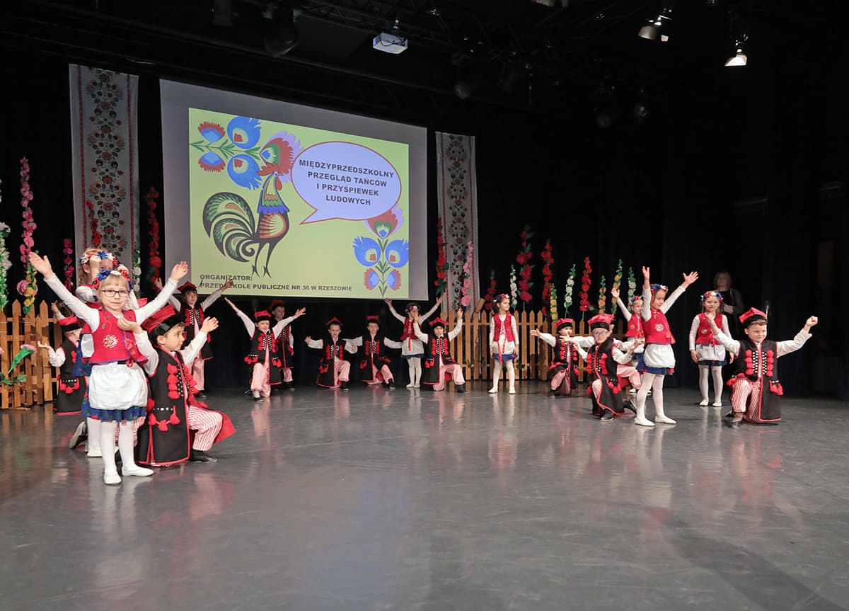 Zdjęcia z V Międzyprzedszkolnego Przeglądu Tańców Przyśpiewek Ludowych, który odbył się 31 marca 2023 w Młodzieżowym Domu Kultury w Rzeszowie. Organizatorem przeglądu było Przedszkole nr 36 w Rzeszowie.