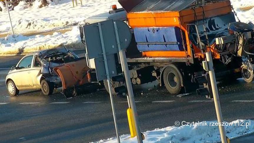 Rzeszów. Pługopiaskarka zmiażdżyła tył nissana micra