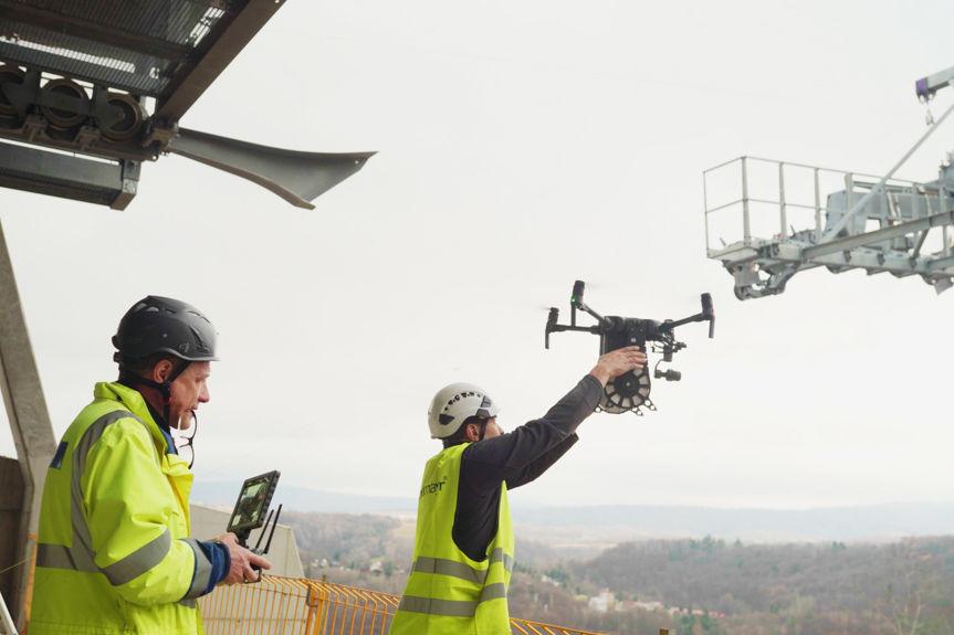 Przeciąganie linii kolejowej nad Soliną przy pomocy drona