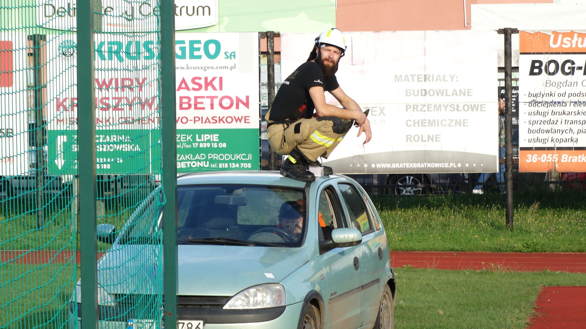 Bryła lodu spadła na samochód osobowy. Jedna osoba ranna