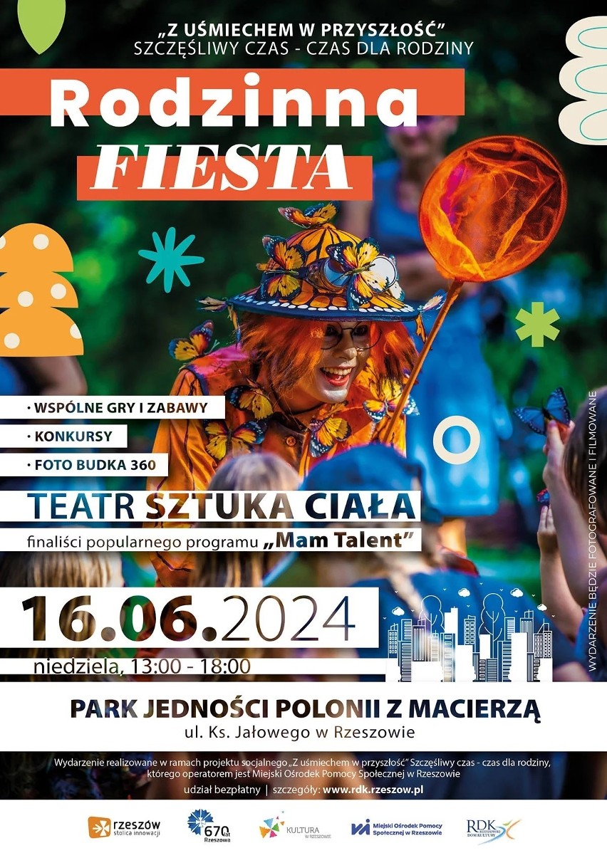 Rzeszowski Dom Kultury wraz z Miejskim Ośrodkiem Pomocy Społecznej w Rzeszowie zapraszają wszystkich mieszkańców na Rodzinną Fiestę, czyli wyjątkową imprezę, która odbędzie się w niedzielę 16 czerwca 2024 roku w godzinach 13:00-18:00 w Parku Jedności Polonii z Macierzą przy ul. Ks. Jałowego. Udział w wydarzeniu jest bezpłatny, a jego główną atrakcją będzie spektakl Teatru Sztuka Ciała – finalistów programu „Mam Talent”.