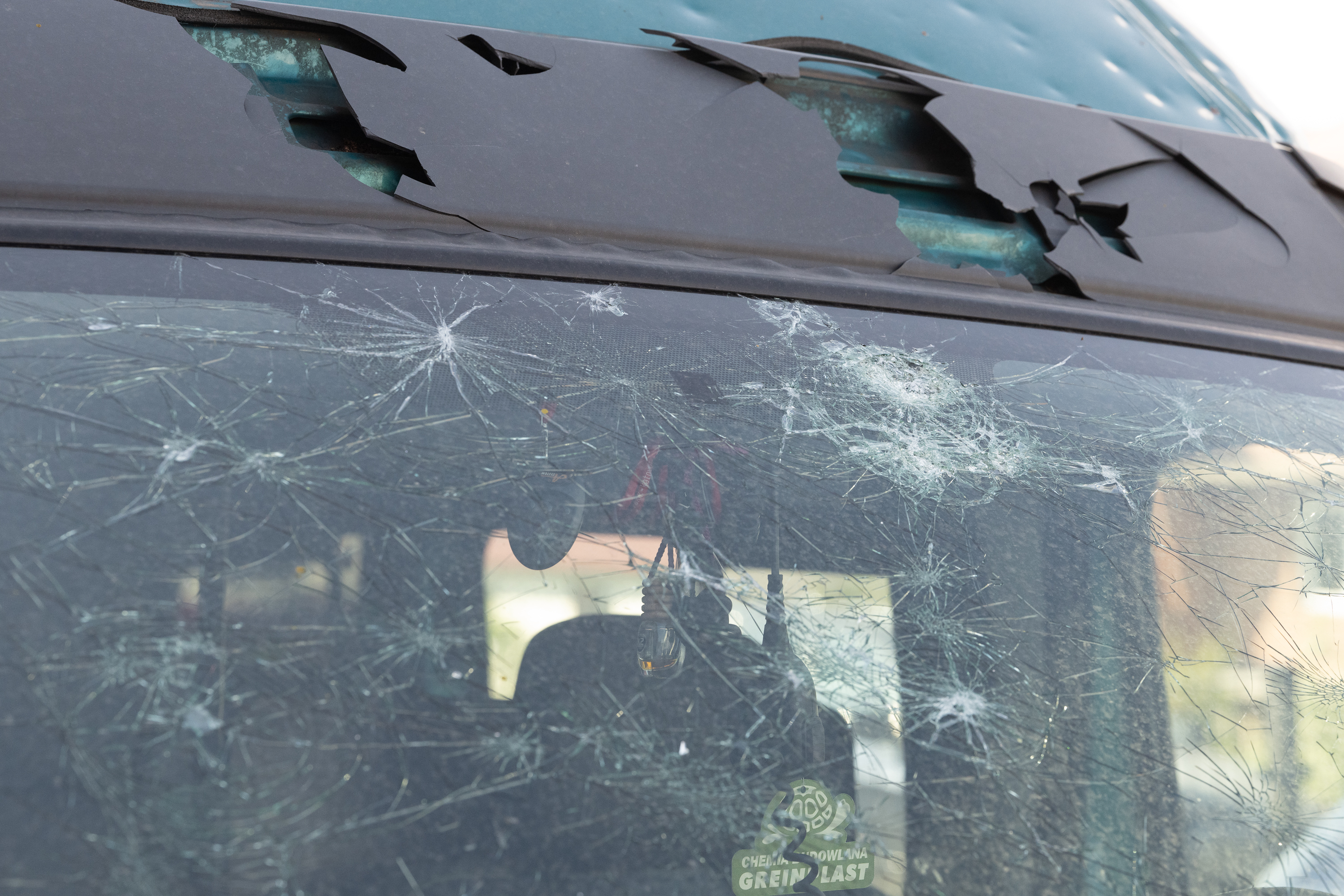 Bryła lodu spadła na samochód osobowy. Jedna osoba ranna
