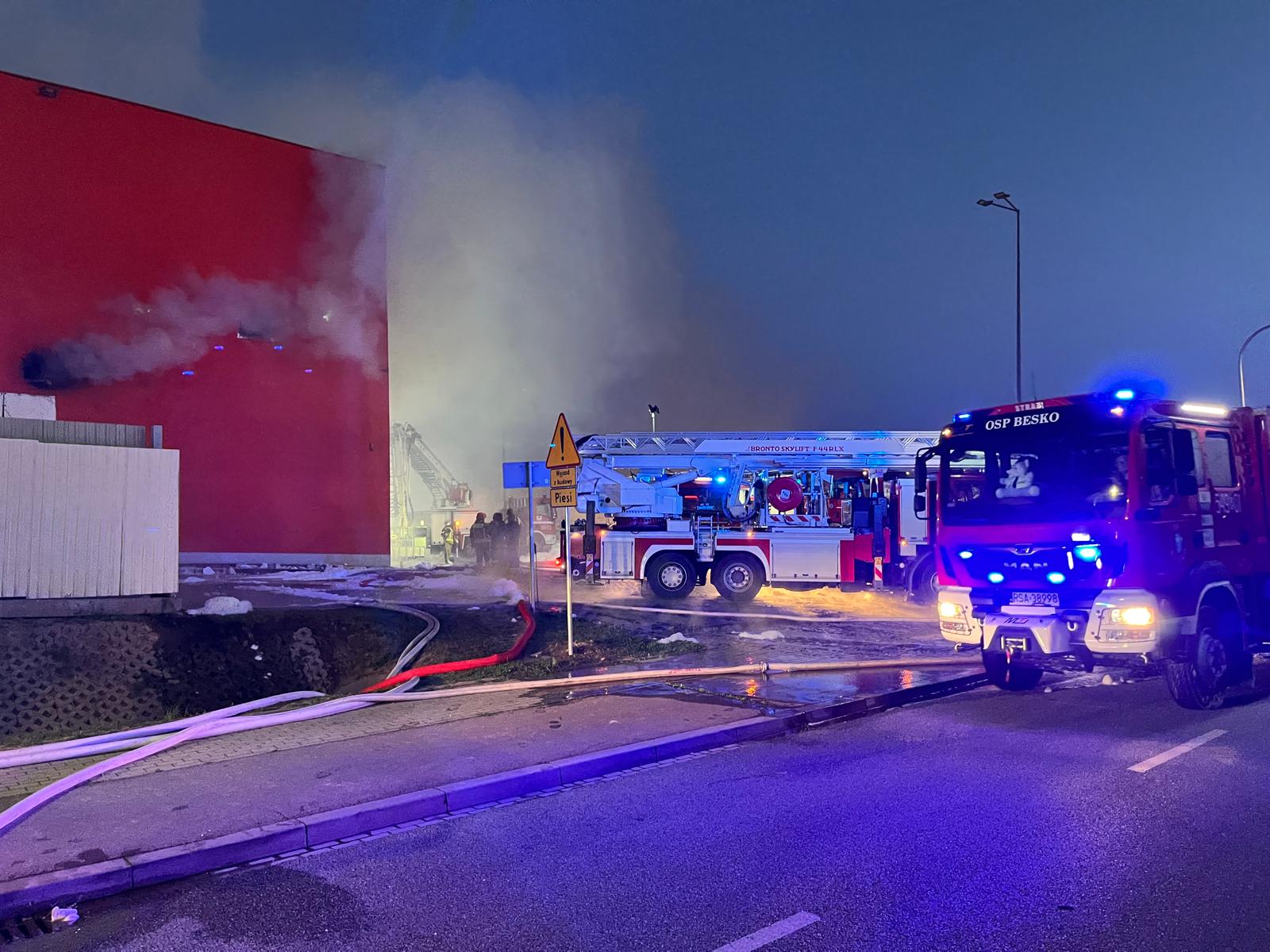 Drugi dzień gaszenia pożaru marketu budowlanego w Krośnie