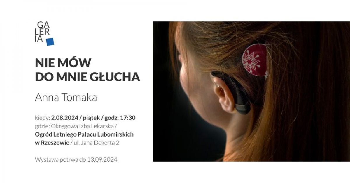 Wystawa fotografii autorstwa Anny Tomaki pt. „NIE MÓW DO MNIE GŁUCHA” ma miejsce w Ogrodzie Letniego Pałacu Lubomirskich w Rzeszowie przy ul. Jana Dekerta 2, w piątek (2 sierpnia). Ekspozycja potrwa do 13 września 2024 r.