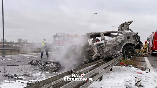 Wypadek i pożar na S19. Dwa auta rozbite, droga do Rzeszowa zablokowana