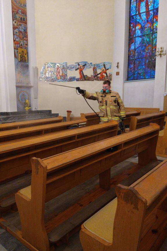 Dezynfekcja kościoła przez strażaków