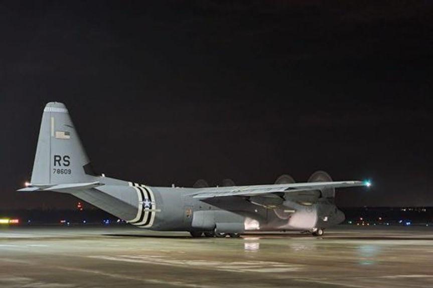 Lądowanie amerykańskiego samolotu Herkules na lotnisku w Jasionce