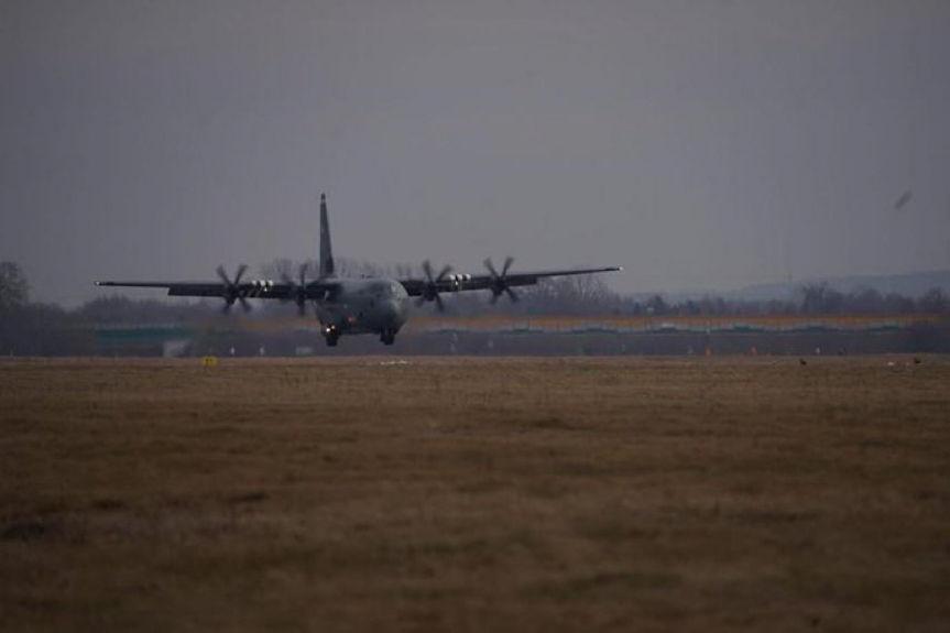 Lądowanie amerykańskiego samolotu Herkules na lotnisku w Jasionce