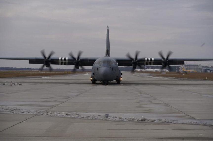Lądowanie amerykańskiego samolotu Herkules na lotnisku w Jasionce